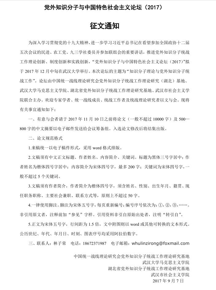 党外知识分子与中国特色社会主义论坛(2017)征文通知