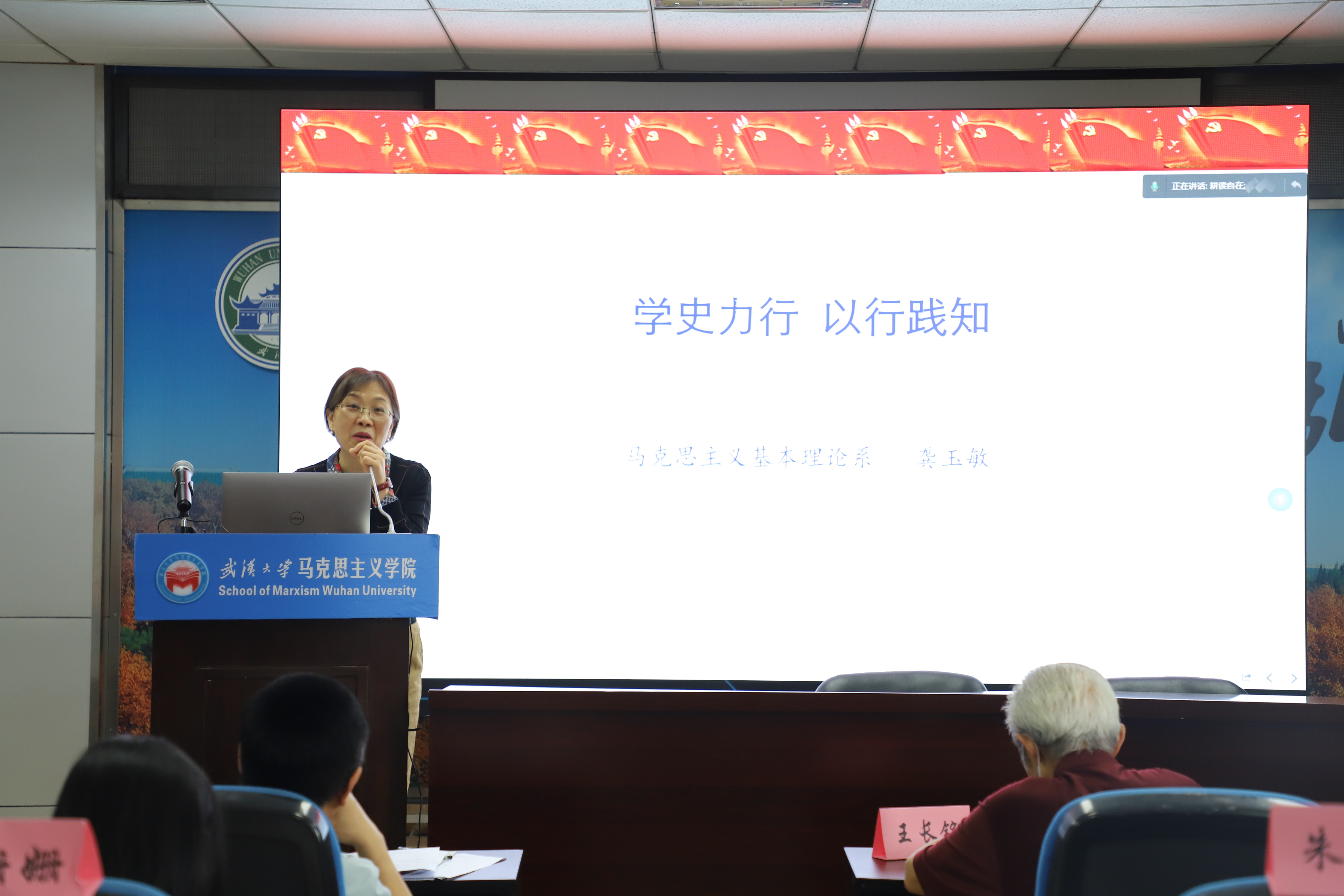 韩进在听完四位支部书记的“微党课”后进行了点评。他充分肯定了马克思主义学院在党史学习教育中开展的一系列宣讲活动,认为马克思主义学院发挥学科优势开展的党史学习走在了前列,四位教师党支部书记的微党课质量高,能够结合自身党史学习收获,把思政课教学融入其中。韩进指出,搞好思政课教学,关键在教师。武汉大学的思政课要依靠一支高素质的思政课教师队伍。各位教师要自觉地把“四史”特别党史学习教育作为重点,善于把百年党史资源融入思政课教学内容中,在推进习近平新时代中国特色社会主义思想的“三进”工作中发挥主动性和创造性,让青年学生真正接受马克思主义、理解马克思主义、喜欢马克思主义、信仰马克思主义。