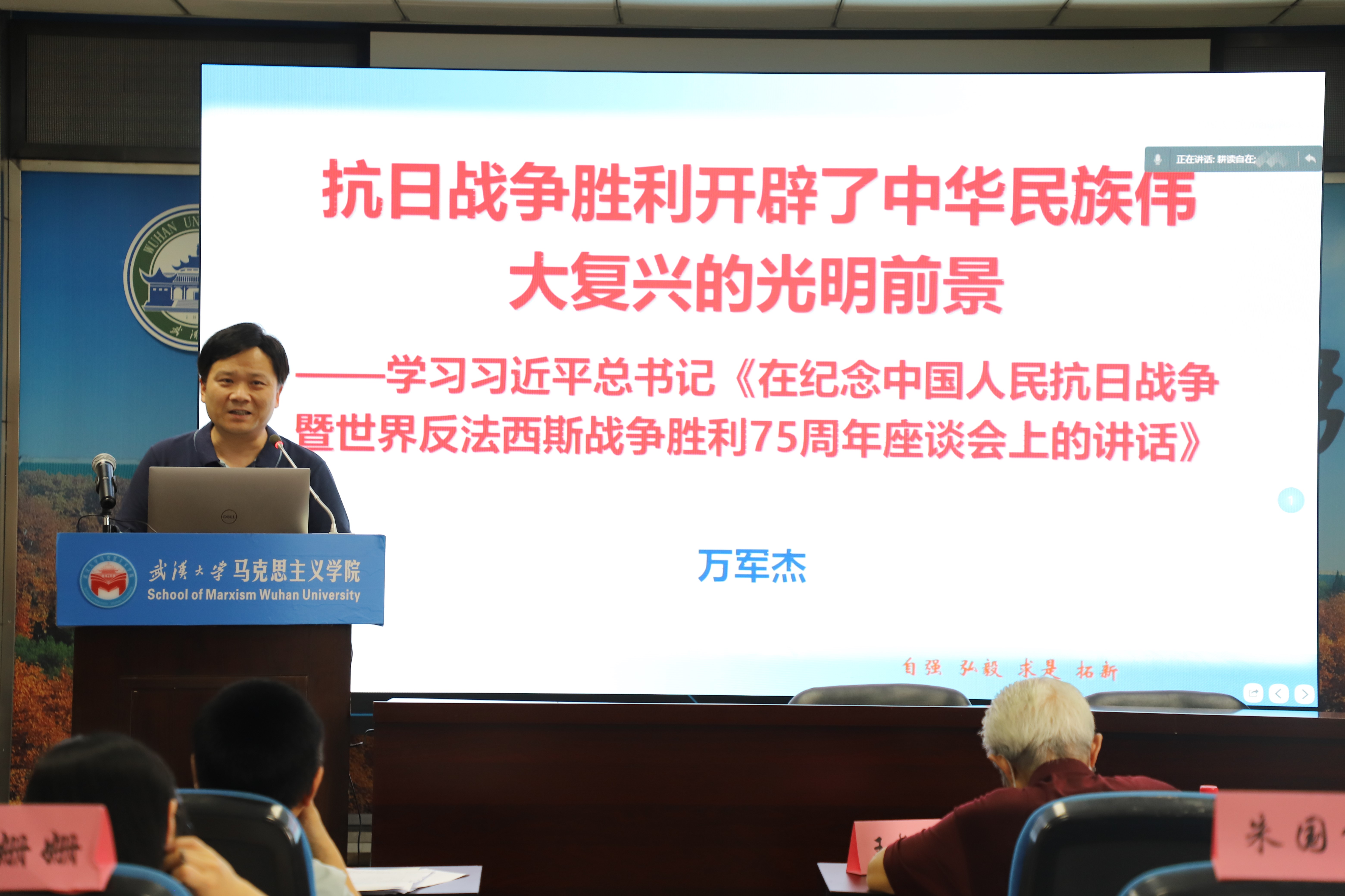 中共党史党建系教师党支部书记万军杰副教授以习近平总书记《在纪念中国人民抗日战争暨世界反西斯战争胜利75周年座谈会上的讲话》为切入点,从中国抗日战争在世界反法西斯战争中的贡献、中国共产党在抗日战争中的中流砥柱作用、抗战胜利是中华民族走向伟大复兴的起点这三个方面进行了阐述。万军杰指出:中国抗战史在百年党史中的地位重要,中国战场是世界反法西斯战争中最早的反法西斯战场和东方主战场,对法西斯的侵略行径起到了重要牵制作用。而中国共产党通过积极倡导、促成、维护抗日民族统一战线,制定和坚持全面抗战的路线和政策,并领导抗日军民开辟敌后战场,动员人民、依靠人民,最大限度地动员了全国军民共同抗战,支撑起全民族救亡图存的希望。抗日战争的胜利意味着近代以来中国人民在反对外国侵略战争中第一次取得完全胜利的民族解放斗争。中国树立起了负责任的大国形象,赢得国际声誉和地位,并为建立新中国奠定重要基础。