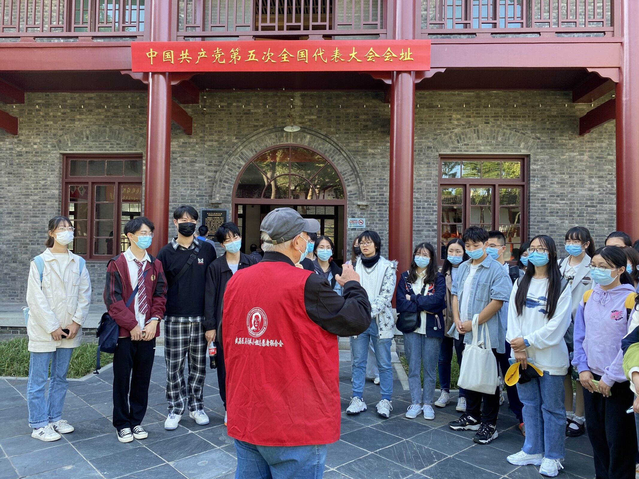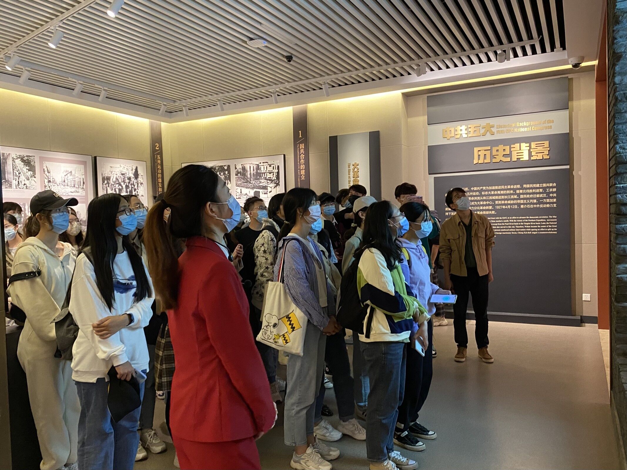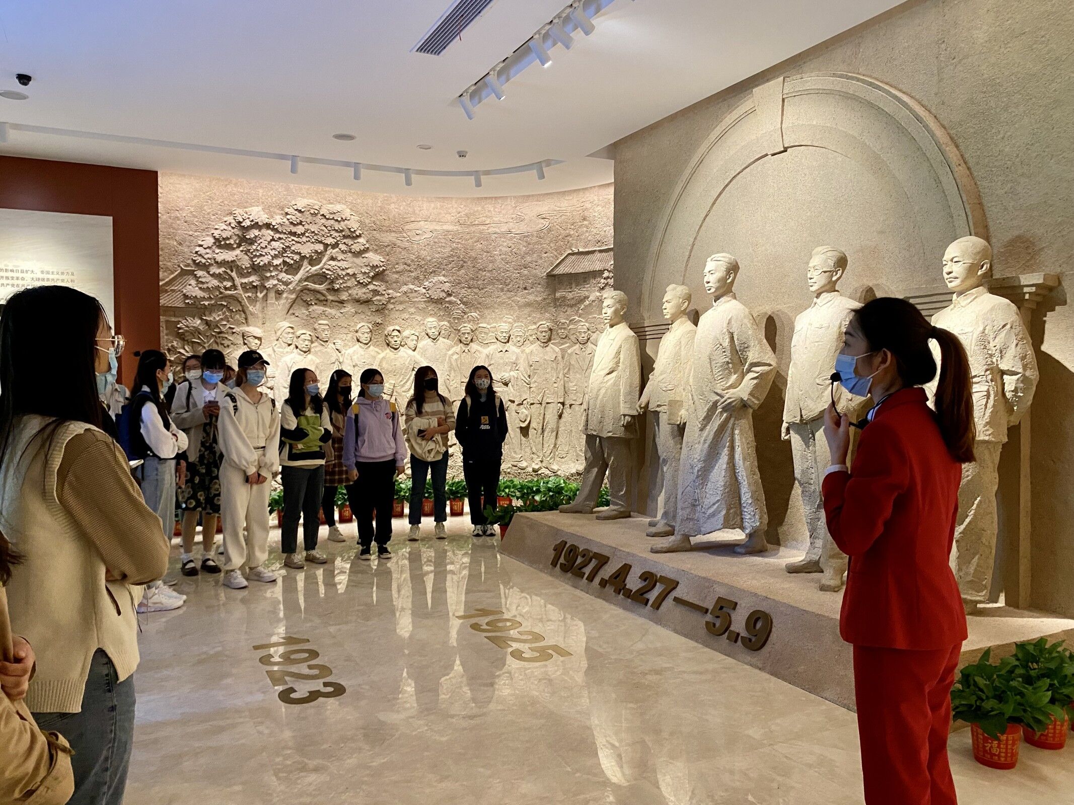 为求新路汇江城,力挽狂澜开新局。师生参观学习的首站来到中共五大会议旧址。“红巷爷爷”为同学们带来了生动的讲解。这一在大革命生死存亡的危急关头召开的非常会议,无疑是中共党史历程中浓墨重彩的一笔。根据讲解员细致认真的陈述,同学们仔细阅读着图文并茂的史料,在中共五大会议旧址中切实感受当年会议的情景,书本上沉默的文字变为了生动的影像资料,历史与现实交织,同学们脑海中不禁勾勒出那些为了中国未来而奋斗的青年形象。