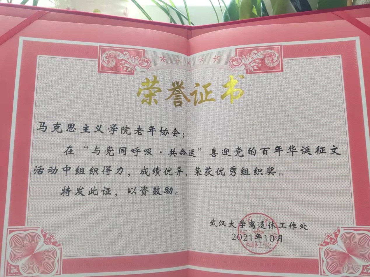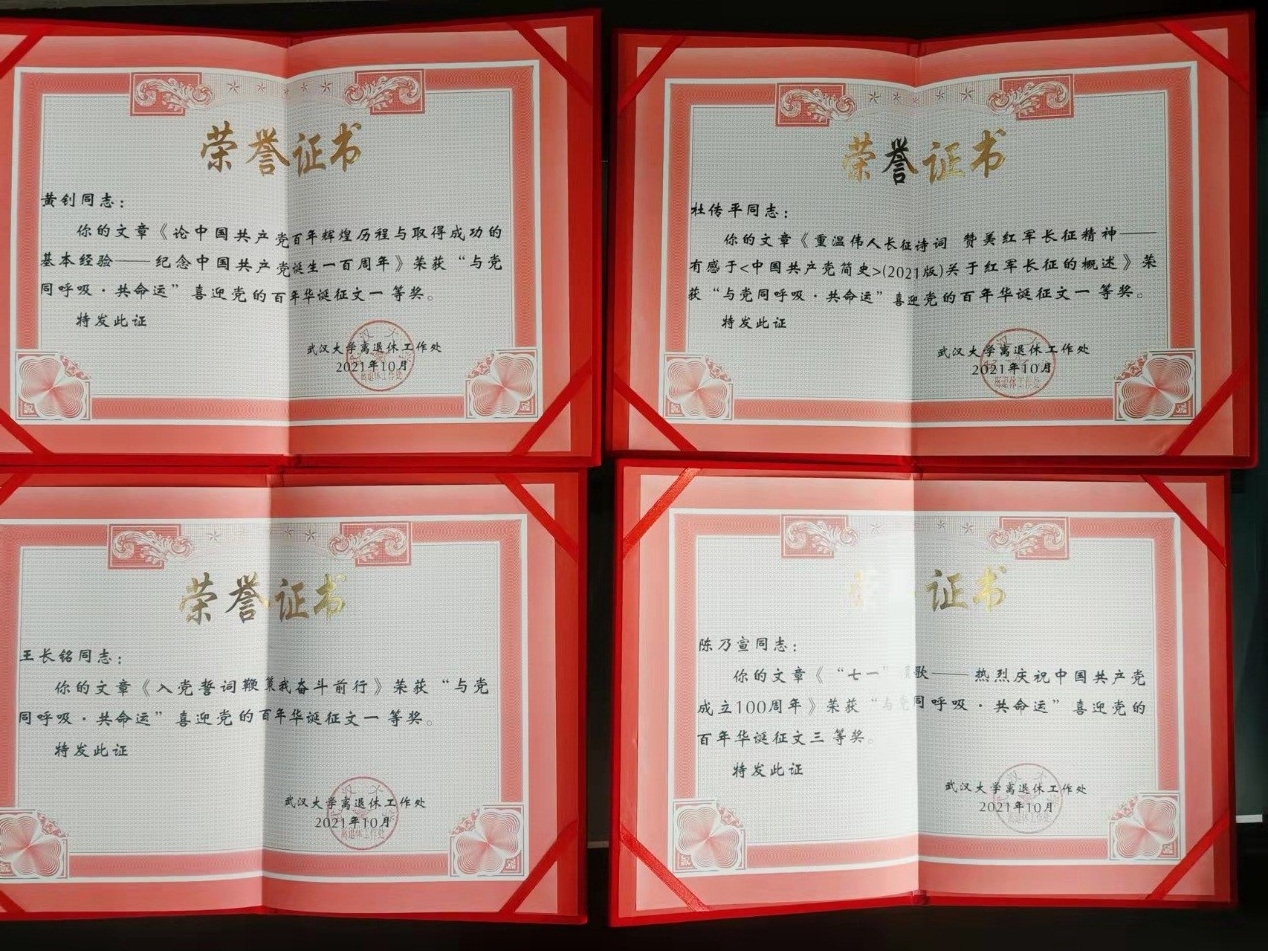 在“与党同呼吸•共命运”主题征文活动中,我院和离退休教职工们积极响应、踊跃参与,以不同视角抒发了对伟大的党、伟大祖国的热爱之情。我院老年协会荣获“优秀组织奖”,其中王长铭教授《入党誓词鞭策我奋斗前行》,杜传平教授《重温伟人长征诗词 赞美红军长征精神——有感于<中国共产党简史(20210版)关于红军长征的概述》、黄钊教授《论中国共产党百年辉煌历程与取得成功的基本经验——纪念中国共产党诞生一百周年》荣获文章类一等奖,陈乃宣教授《”七一“颂歌——热烈庆祝中国共产党成立100周年》荣获文章类三等奖,王长铭教授《六唱母亲——百年华诞唱给母亲的歌》和陈乃宣教授《同舟共济度时艰》荣获诗词类纪念奖。