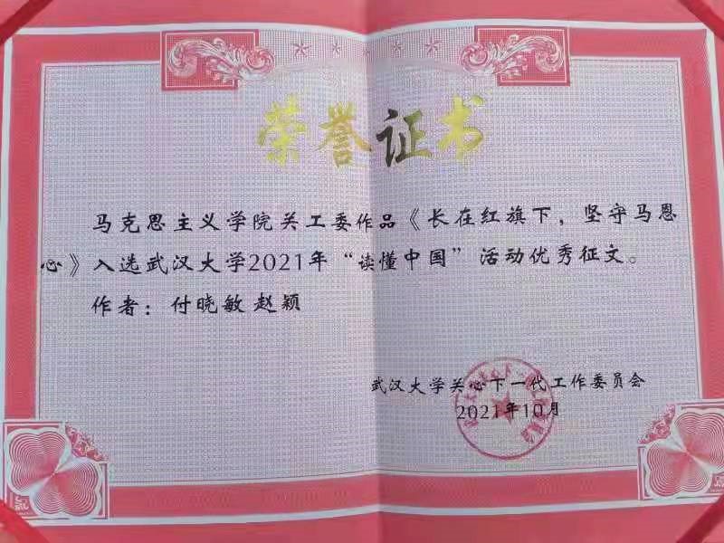 在“读懂中国”活动中,我院积极组织青年学生和老党员代表进行深入交流,挖掘、记录、整理他们的入党初心和历程及为党奋斗的感人事迹和真实感悟并进行充分展示和广泛传播,取得了很好的教育效果和社会影响。学院关工委被评为“优秀组织单位”;文章《听老教授漫话人生》荣获”最佳征文“称号;文章《初心如磐志高远,奋楫笃行践使命》、《长在红旗下,坚守马恩心》被评为“优秀作品”。