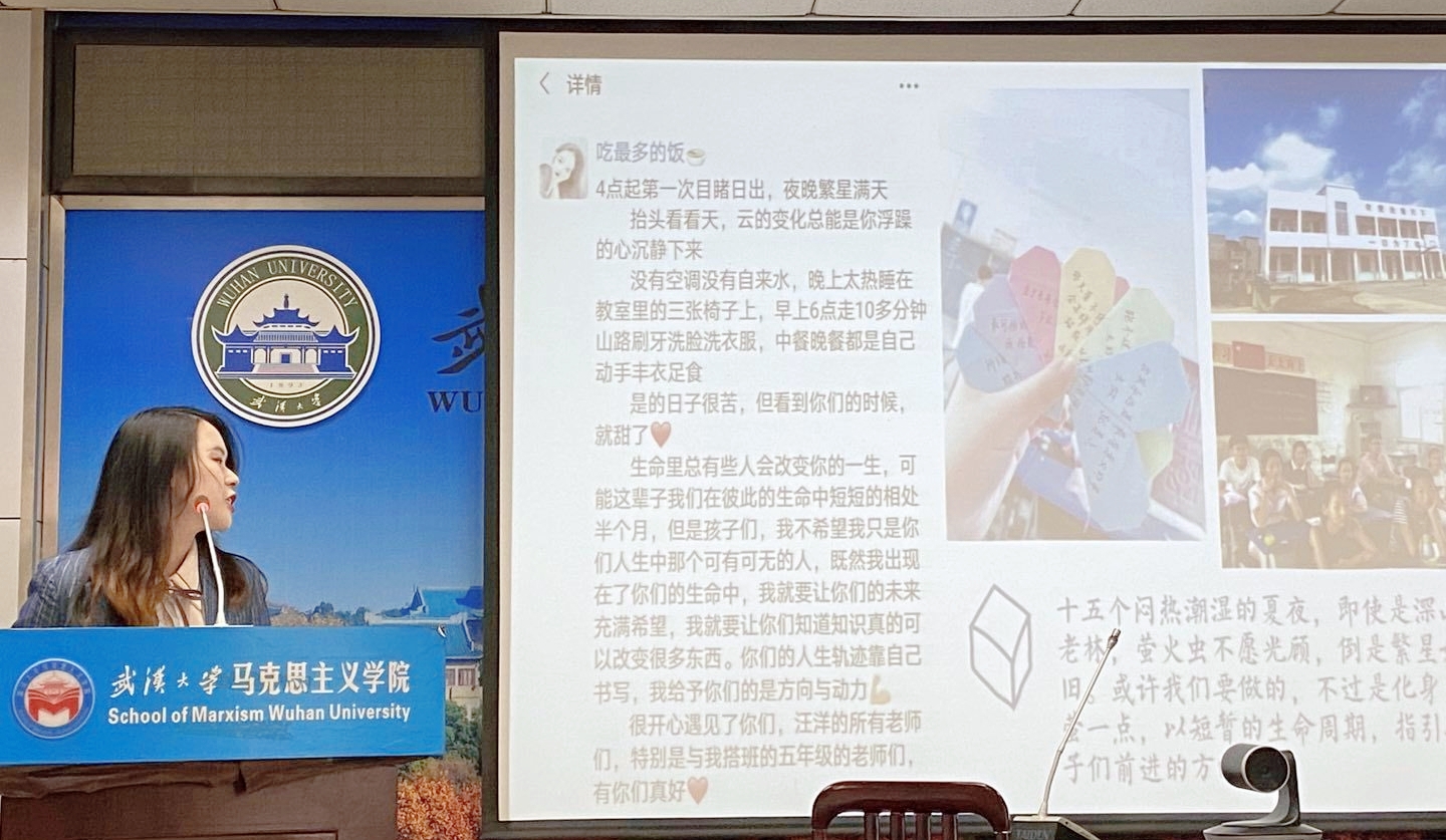 一号志愿者郭傲围绕“一个公益人的自述”展开,向大家展示了她参与第七届军运会接待服务、担任中国世青创新中心抗击新冠肺炎疫情倡导志愿者和报名武汉第二期新冠疫苗临床研究志愿者的多种志愿服务经历。同时,她还提到了最让她感到难忘的一次志愿经历——在大悟县高店乡汪洋村支教长达半个月。她说,“或许我们要做的,不过是化身火萤一点,以短暂的生命周期,指引孩子们前进的方向。”最后,她总结道,志愿服务是唤醒一种意识、传递一种温暖的过程。她希望在志愿服务中每个人的星星之火成燎原之势,去温暖更多的人。
