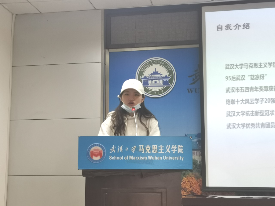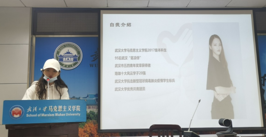 首先,发言人郑欣怡做了简短的自我介绍。从自身出发,作为一名土生土长的“武汉伢”,郑欣怡在疫情最严重的时期主动迎难而上,为深爱的武汉和武大贡献抗疫力量。担任四份志愿者工作的她,在兼顾学业、创业等事务的同时,还负责商超志愿服务、远程教育结对、校园宣传记者等工作。尽管每天连轴转,但她在奉献中温暖着自我与他人,在志愿活动中深切领会青年志愿者所肩负的责任与担当。