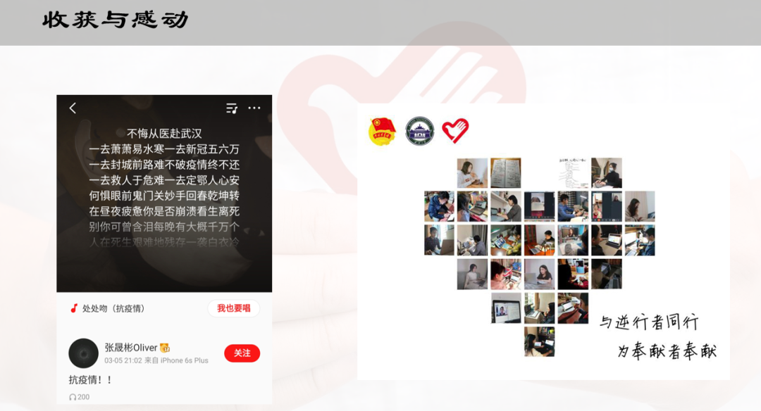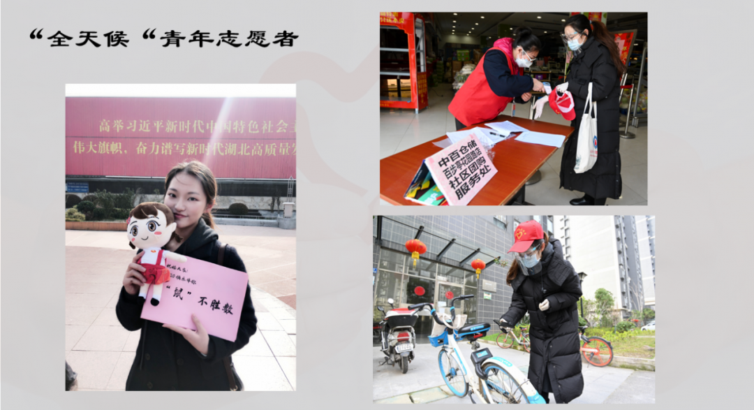 随后,郑欣怡通过图片、视频的形式,向大家分享了自己在志愿活动中的丰富经历。分拣安心菜、结对助学、收集整理抗疫队资料……在燃烧自我的同时,郑欣怡也收获了成长与进步:从前那束“温室中的花朵”,已然蜕变成了吃苦耐劳的“大力少女”,坚定且自信,在江城的寒冬中傲然绽放出希望之花。