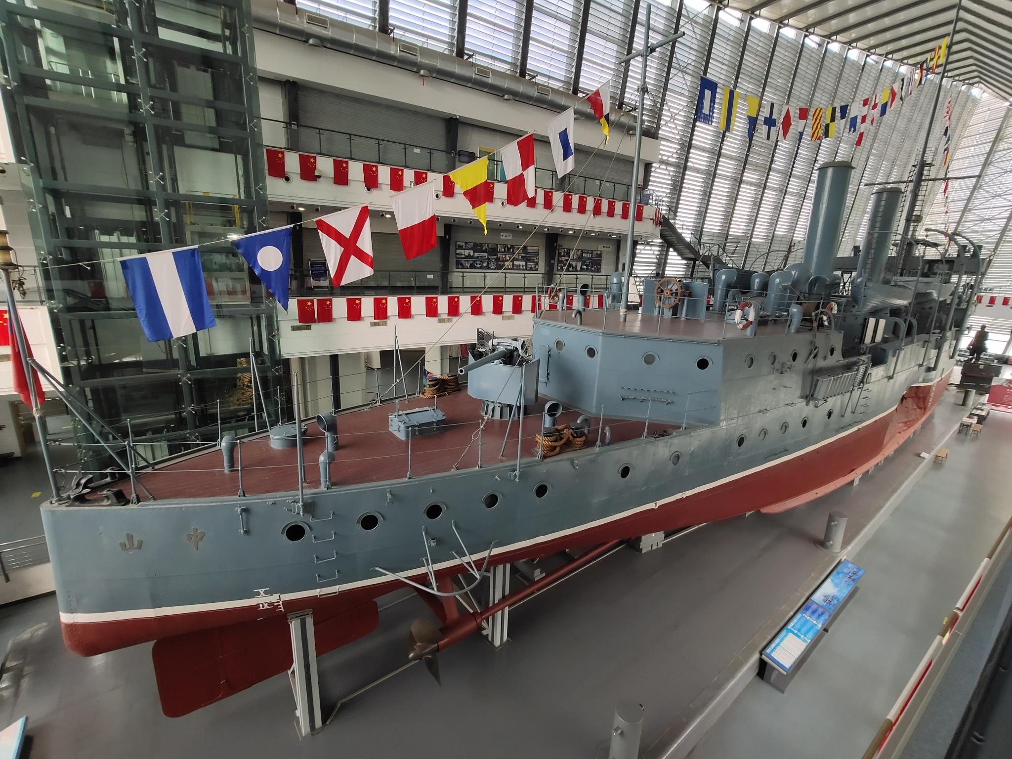 参观完室外雕像之后,大家跟随着吕昌霖主任进入了中山舰博物馆内部,由另一位讲解员向师生们介绍中山舰的复原本件。她向大家概述了中山舰的整体状况和使用情况,并仔细介绍了中山舰的前部、中部、后部、船舱、甲板等部位,还重点强调出它沉没时的摔出的裂痕。通过讲解,大家发现,中山舰的建造技术在当时并不是世界领先的,当时的武器装备也并不算精良,但我们的先辈却依然坚持抗战并最终取得了胜利,这种大无畏的革命精神令一行人十分震撼。