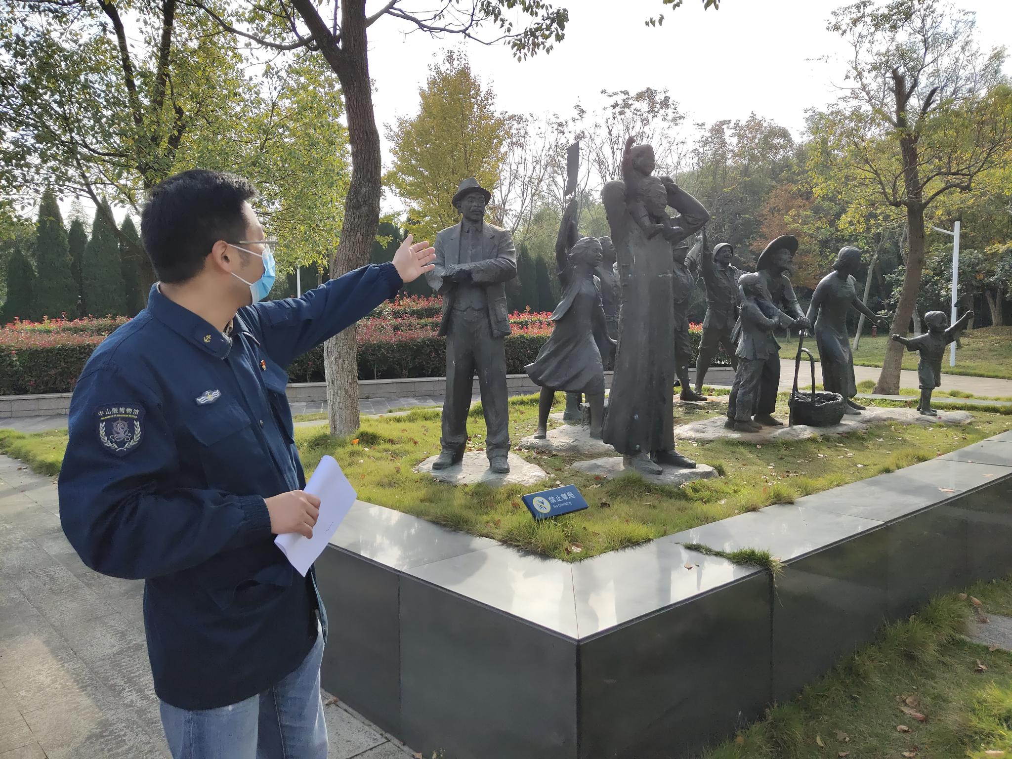 进入园区,首先由中山舰博物馆的吕昌霖主任向师生们依次介绍了园区室外的雕像与建筑。按照游览顺序,“奔赴前线”“万家岭大捷”“全速前进”等雕像让师生们深刻感悟到全国各阶层人民在民族危难面前团结一心共同抗日的英勇决心;“2·18”“4·23”等具有纪念意义的日期标识触发了师生们对战士们不畏艰难的敬佩;烈士衣冠冢及纪念碑、中山舰博物馆主馆等建筑展示了中国战士们为了人民安危不畏强敌、不惧牺牲的英雄精神……他们的爱国精神、抗争精神与牺牲精神都牢牢地映刻在了一行人的心中。