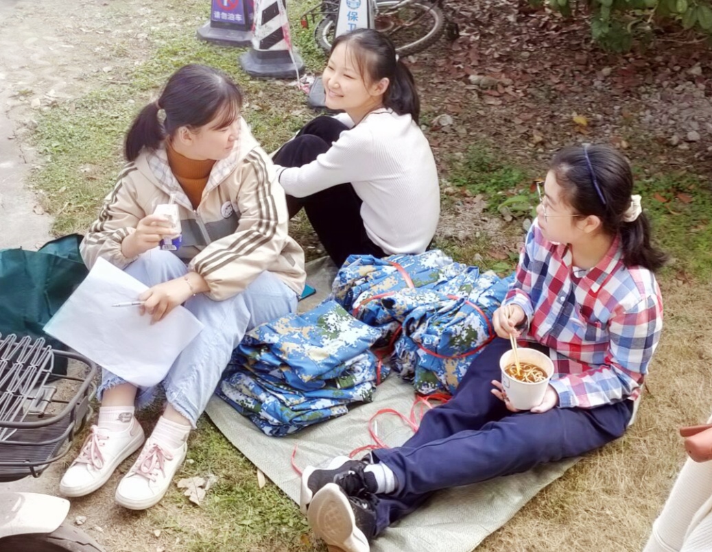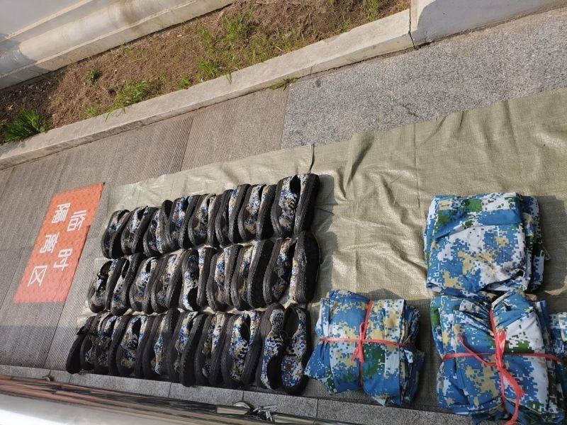 10月30日中午12点,学员们准时集合,分别前往湖滨十二舍与梅园四、五舍进行军训服的收集。在确保不影响其他同学正常进出的情况下,学员们于宿舍楼下空旷的草地、斜坡上铺设编织袋,并且有序区分外套、上衣、裤子与鞋子的摆放位置。
