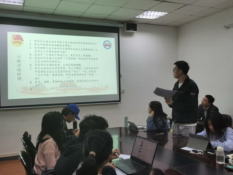 罗梓锐同学对党的十九届六中全会公报内容进行了梳理与解读。首先,他阐述了党总结百年奋斗重大成就和历史经验的背景,带领支部成员回顾了党在各个时期面临的主要任务、取得的奋斗成就及理论成果。其次,罗梓锐同学向支部成员了讲述了党百年奋斗的历史意义与历史经验,并对党的二十大进行了展望。最后,罗梓锐同学强调,作为新时代中国青年应以史为鉴、开创未来,埋头苦干、勇毅前行,勿忘昨天的苦难辉煌,无愧今天的使命担当,为实现第二个百年目标、实现中华民族伟大复兴的中国梦而不懈奋斗。